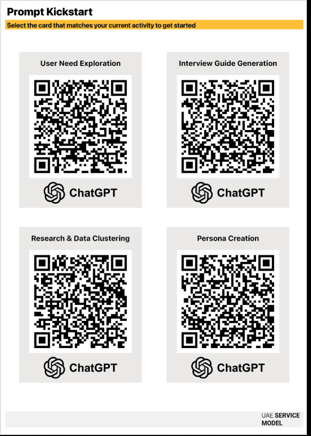This toolkit includes a deck of cards. Each card features a specific title corresponding to a design task (e.g., "User Need Exploration") and a unique QR code that links to a tailored, expert AI prompt. Select the card that matches your current activity to get started.
