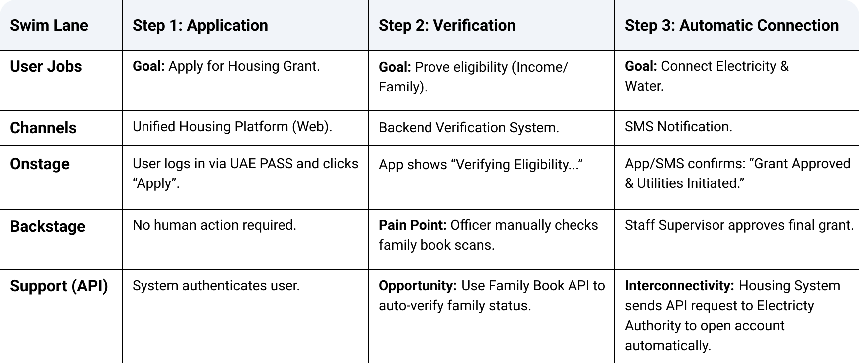 In this example, we map the journey of a citizen applying for a housing grant. The Blueprint reveals the hidden friction points that a simple Journey Map might miss: