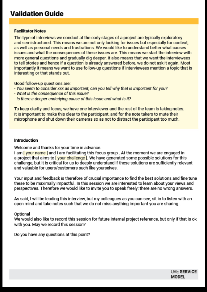 The Validation Guidelines help teams test and refine solutions through direct user feedback. By using structured interviews and focus group discussions, teams can evaluate whether proposed solutions meet user needs, align with operational realities, and deliver measurable value. This process ensures that ideas are validated by real users before scaling or implementation, reducing risk and improving the quality and adoption of the final service.